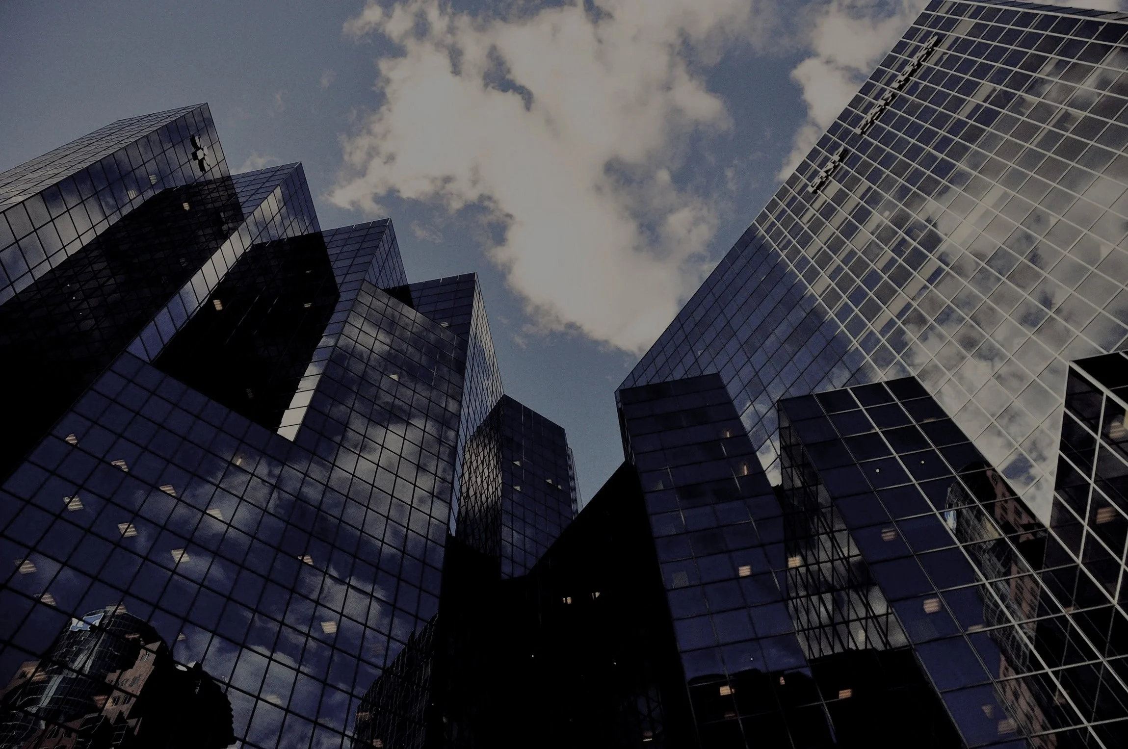 • Reflections of clouds in the glass windows of tall modern skyscrapers in an urban setting.