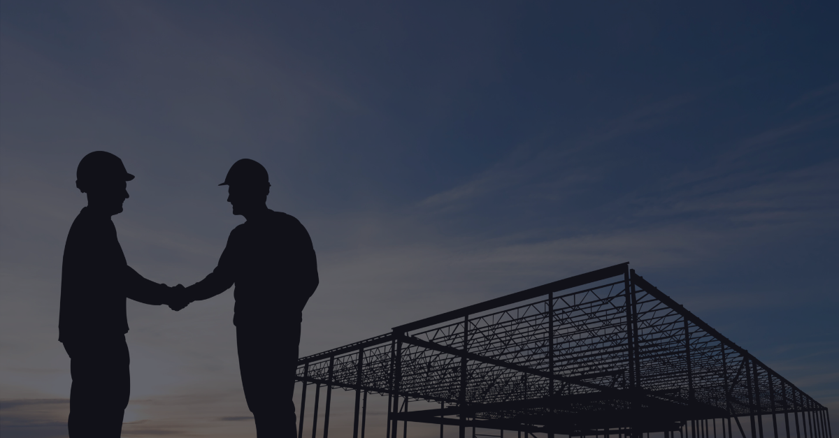 • Silhouette of two construction workers shaking hands at sunset with a building framework in the background.